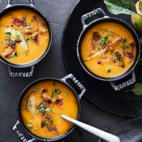 In this recipe, caramelized pears add a sweet note to classic butternut squash soup. Thin slices of prosciutto—an air-dried, salt-cured ham from Italy—are baked until crispy and used as a savory garnish. They provide a pleasing textural contrast to the velvety soup, while lending just the right amount of saltiness and savor.