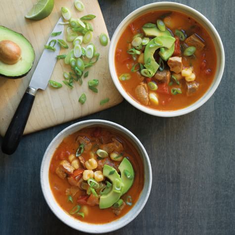 Pozole, a hearty pork and hominy soup, is made all over Mexico with slight variations. You can turn this into pozole verde by replacing the tomatoes with tomatillos. Traditionally made with partially cooked and cleaned hominy (nixtamal), this quick version uses canned white hominy. The pozole is also delicious made with chicken in place of pork.