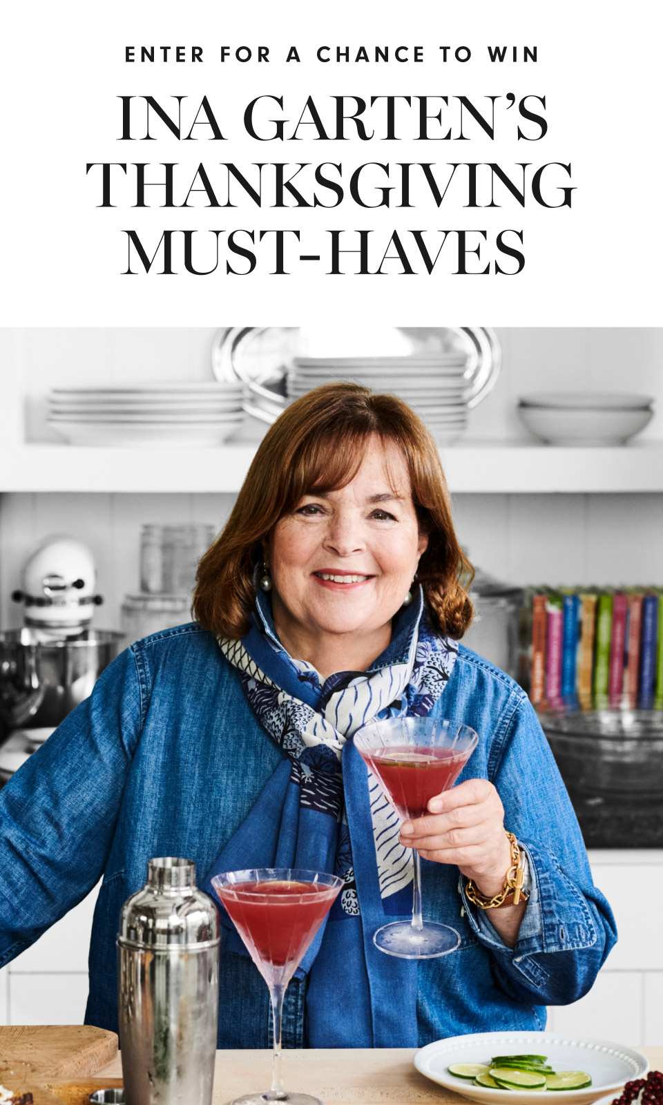 Enter for a chance to win Ina's Thanksgiving Must-Haves (Approximate Retail Value: $4054.75); NO PURCHASE NECESSARY TO ENTER OR WIN; odds of winning depend upon number of eligible entries received; Sweepstakes begins on September 28, 2022 and ends on November 15, 2022; open only to residents of the 50 United States of America or the District of Columbia excluding who are 18 years old or older as of entry time; void where prohibited; see Official Rules for complete details at www.williams-sonoma.com/inagartensweepstakes; Sponsor: Williams-Sonoma, 3250 Van Ness Avenue, San Francisco, CA 94109.
