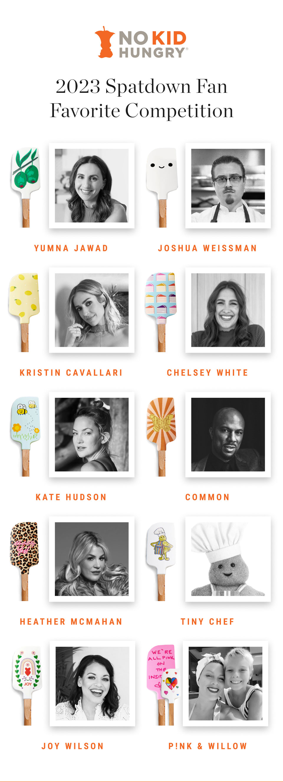 Each year, Williams Sonoma launches a collection of spatulas designed by celebrities and chefs with proceeds benefiting No Kid Hungry®. This year we’d like you to help pick our Spatdown Winner, for an additional $5,000 donated to No Kid Hungry® in their name.