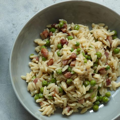 Here, Nigella Lawson cooks pasta much as she would traditional risotto. While Italy respects its traditions, she explains, this way of cooking pasta—pasta risottata—is actually quite the new, cool thing. When Nigella has come across this way of cooking pasta in Italy, it’s not in fact involved orzo or other rice-shaped pasta; the “risottata” part refers to the method, not the pasta or the end result. Pennette or macaroni or other similarly small pasta would also work, though cooking times may vary a little.