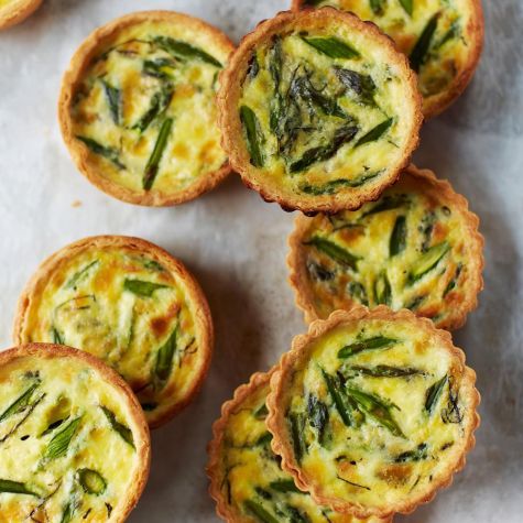 Remove the quiches from the pans and let cool slightly or to room temperature before serving. Makes twelve 3-inch (7.5-cm) quiches.