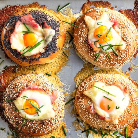 In this fun twist on the childhood favorite Toad-in-a-Hole, we use a halved bagel instead of sandwich bread, enlarging the bagel’s hole to create a “bowl” to bake a perfectly runny egg. Double or triple the recipe for an easy weekend brunch celebration, but remember to space the bagels a few inches apart on your baking sheet since the crispy ring of melted Parmesan around each is one of the best parts.