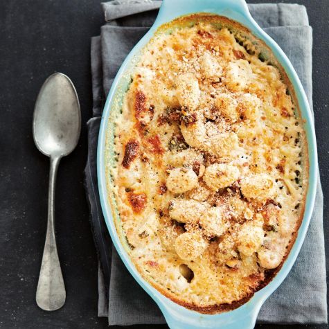 Pick up packs of fresh gnocchi, the little potato dumplings, to create easy—but filling—dinners in a pinch. They are lovely boiled until tender and simply sauced, but easily dressed up in a gratin, featuring decadent Italian bacon and cheeses.