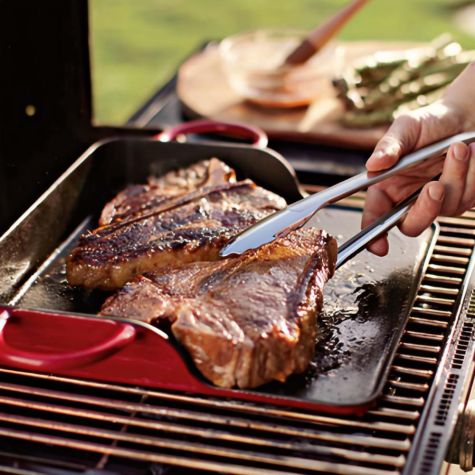 In this recipe from Chef Bryan Voltaggio, hefty porterhouse steaks are prepared using a two-step process: first, they’re slowly cooked at a low temperature in a sous vide immersion circulator, which can be done a day in advance. Then, just before serving, the steaks are briefly seared on a la plancha cast-iron griddle set over an outdoor grill. Crisp-tender vegetables, also prepared on the grill, are served alongside. Round out the meal with Baked Goat Cheese Orzo.