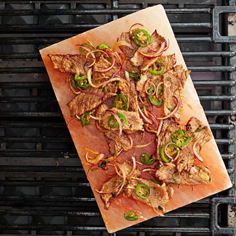 Teppanyaki is a style of Japanese cooking that involves grilling or stir-frying food on a griddle or iron plate. Here, thinly sliced steak is marinated with sesame oil, garlic, ginger and other seasonings, then quickly seared on a Himalayan salt plate over a backyard grill. The plate imparts just the right amount of salt to the meat as it cooks.