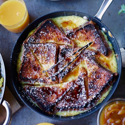 A fragrant vanilla bean and whole cardamom pods are baked right into this dish, resulting in an unusually decadent French toast. Dressed up with a Meyer lemon marmalade that’s simultaneously sweet and tart, it can even be served as a dessert.