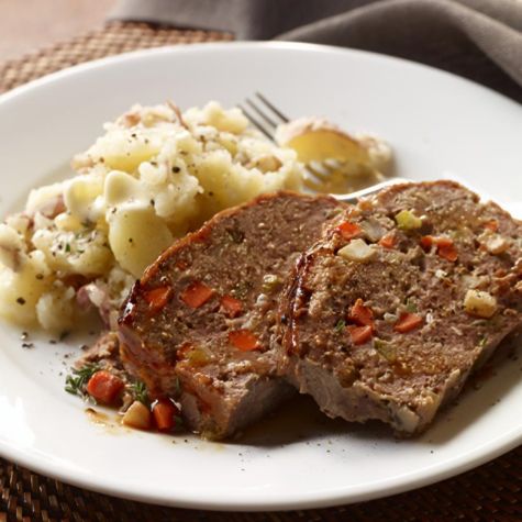 Transfer the mixture to the prepared loaf pan. Spread the pineapple glaze evenly on top of the meat loaf. Bake until an instant-read thermometer inserted into the center of the meat loaf registers 160°F, about 1 hour. Let the meat loaf rest for 10 minutes, then turn it out onto a cutting board and cut into slices. Serves 6.