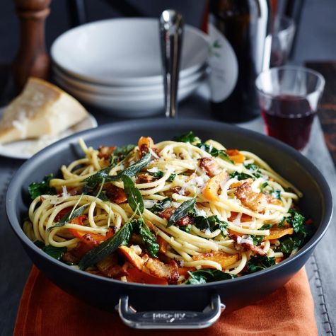 Bucatini, a pasta that is slightly thicker than spaghetti and has a hollow center, is a good choice for this hearty autumn pasta. If you’d prefer not to fry the sage leaves, you can omit them and garnish the pasta with a bit of chopped fresh sage instead.
