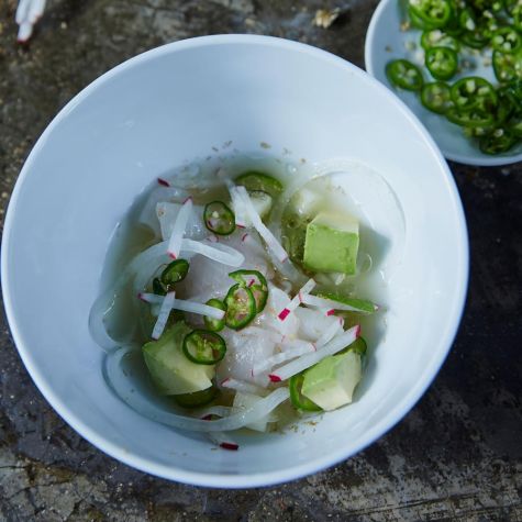 The earthy, smoky flavor of the mezcal sets up both the sharpness of the citrus in the marinade and the fattiness of the avocado in this dish from Eric Werner and Mya Henry’s cookbook Hartwood, which tells the story of their restaurant in Tulum, Mexico. They suggest, “When shopping for marlin, look for a lean fillet with no fatty layers between the muscle—that fat is too chewy for a ceviche. If you can’t find lean marlin, ask for lean swordfish. If the only marlin (or swordfish) at the fish market is fatty, then don’t make ceviche: those cuts are best roasted in the oven.” Hoja santa, also known as Mexican pepper leaf, has a flavor reminiscent of eucalyptus, mint, tarragon and black pepper. In the Yucatán they use the large, heart-shaped leaves to wrap fish, to flavor green moles and to make a liquor called verdin, but you can omit it if you like.