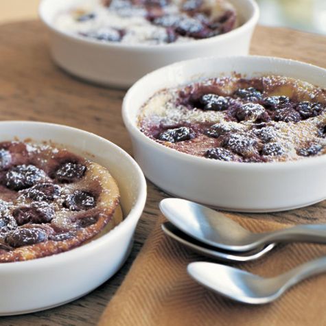 Bake until the clafoutis are puffed, the edges are browned and the centers are lightly browned, about 30 minutes. Immediately dust with confectioners’ sugar shaken through a sieve and serve. Serves 6.
