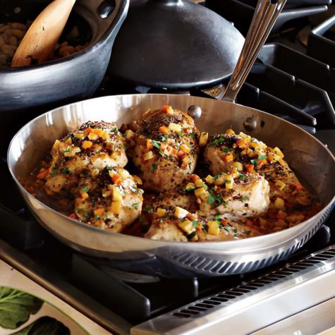 Season the chicken on both sides with salt and pepper. In an 11-inch French skillet over medium-high heat, warm the oil until almost smoking. Add the chicken, skin side down, and cook until the skin is crisp and golden brown, about 5 minutes. Turn the chicken over and reduce the heat to medium. Cover and cook until an instant-read thermometer inserted into the thickest part of the chicken registers 160°F, about 8 minutes. Transfer the chicken to a plate and cover loosely with aluminum foil.
