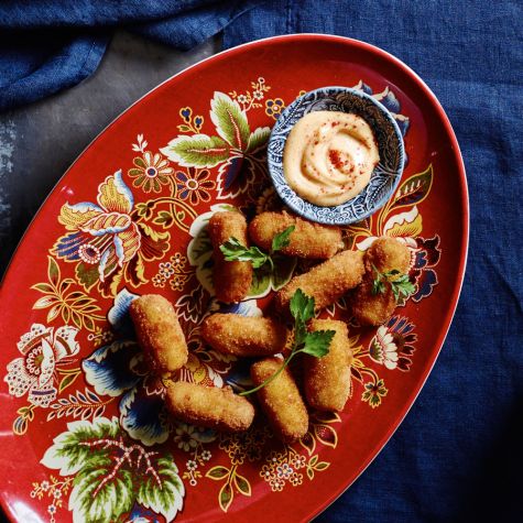 The crispy, savory bites known as croquetas are enjoyed as a tapa throughout Spain. They are often made with mashed potatoes and ground or chopped meat (such as the chicken used here), and then lightly breaded and deep-fried. To ensure your croquetas emerge perfectly crisp, be sure to maintain the frying oil at 365°F (185°C) and don’t crowd the pan. Serve with a simple garlic aioli for dipping.