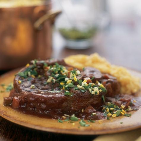 In this classic recipe from Lombardy, Italy, veal shanks are slowly braised to a melting tenderness. The rich marrow of the bones is as delectable as the meat itself. Pass out small spoons at the table so diners can scoop out every delicious bit. The traditional accompaniments are gremolata, a parsley and lemon relish that provides a welcome counterpoint to so much richness, and golden risotto perfumed with saffron.