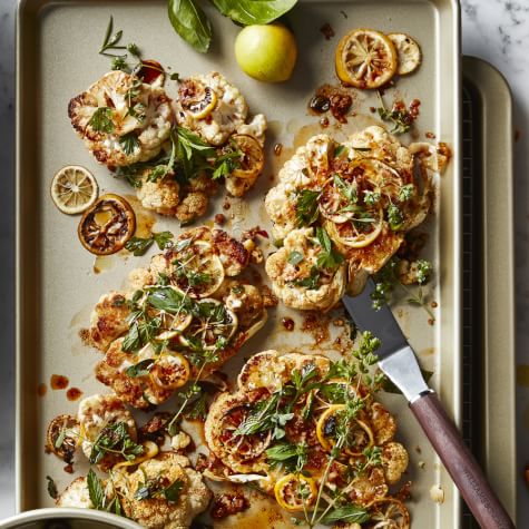 Transfer the cauliflower steaks and lemon slices to a serving platter. Sprinkle with more Parmesan, garnish with herb leaves and serve. Serves 4.