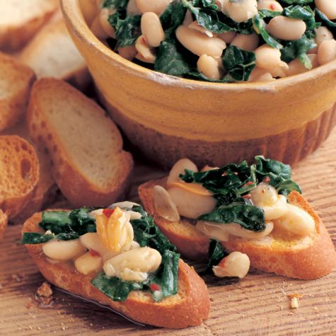 Spoon 1 heaping Tbs. of the beans and greens mixture on top of each toast and drizzle with olive oil. Arrange on a platter or individual plates and serve immediately. Makes 14 crostini; serves 3 or 4.
