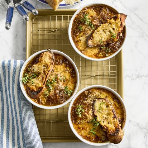 “French onion soup is not just a forever favorite of mine,” writes Deb Perelman, author behind the award-winning blog Smitten Kitchen. “It’s what I consider a core recipe in my arsenal because it aligns with so much that I think is important in cooking. It’s totally budget-friendly (and downright cheap) to make. It’s made from buy-anywhere ingredients and very few of them—99% of the flavor comes from just onions, cooked very slowly, transformed by a technique you need no advanced cooking skills to master. And it has a depth of flavor that is unparalleled in almost anything else I know how to make.”