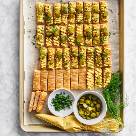 If, like our Test Kitchen chefs, your favorite part of a deviled egg is the creamy filling, this is the appetizer for you! First, prepare the usual filling, which gets a “devilish” kick from Dijon mustard and smoked paprika. Then pipe it onto crisp crackers made from buttery puff pastry for the satisfying crunch that’s missing from a standard deviled egg. And speaking of nontraditional—why not put a fresh spin on your Thanksgiving Day celebrations and invite friends over for a casual cocktail party. Forget the big bird and serve drinks and savory appetizers like this one. Even if tradition is your thing and you’re cooking a turkey with all the trimmings, these crackers will make great pre-dinner nibbles while guests mingle.