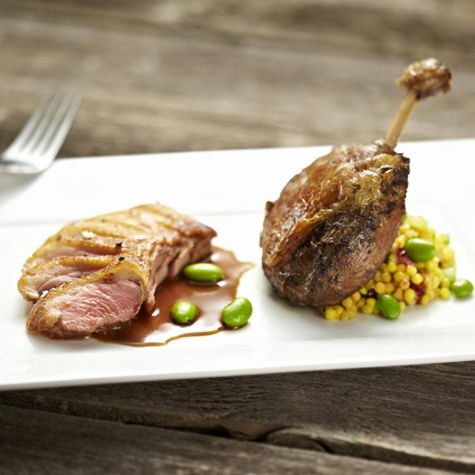 Place the duck breasts, skin side down, in a pan over medium heat and render out as much of the fat as desired. Turn the breasts over and sear the meat side for no more than 60 seconds. Cut into slices and serve with the duck legs. Serves 2.