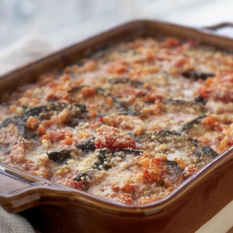 There are many versions of this dish throughout southern Italy. Some include a meat sauce, others slip hard-cooked eggs between the layers and still others call for dipping the eggplant slices in beaten egg and breadcrumbs before frying. This recipe is from Campania, where it is typically served as an antipasto, as a side dish or even cold as a sandwich filling. Make sure the oil is fully heated before you add the eggplant, or the slices will absorb too much oil.