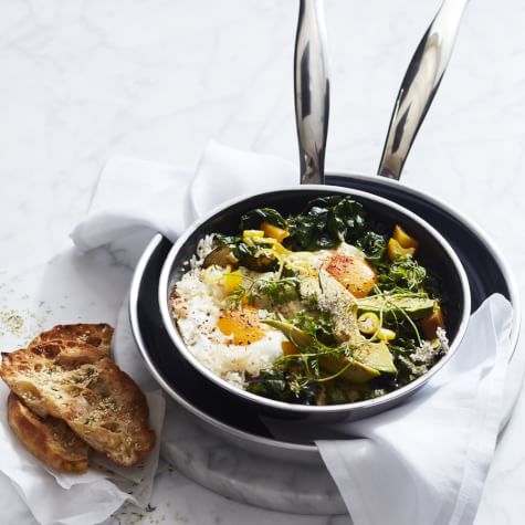 Hearty and healthy, this dish is all about the fresh green produce, including Swiss chard, avocado and cilantro, served on a bed of rice and topped with runny fried eggs. Thin slices of mild banana pepper add pops of tangy-sweet flavor, while a sprinkling of Aleppo pepper lends fruitiness and gentle heat. Serve as a brunch entrée or a satisfying breakfast for dinner.