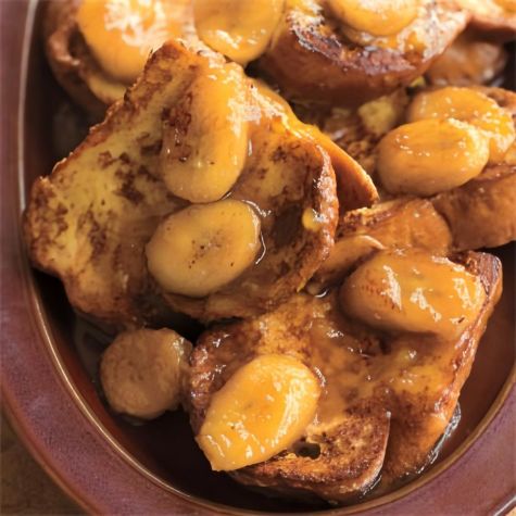 Cooks in many countries use the same method for reviving day-old bread: they dip it in eggs and milk or cream and then quickly panfry it. Our contemporary French toast is a descendant of pain perdu (literally “lost bread”), popularized in the kitchens of New Orleans. This luscious version is topped with caramelized bananas.