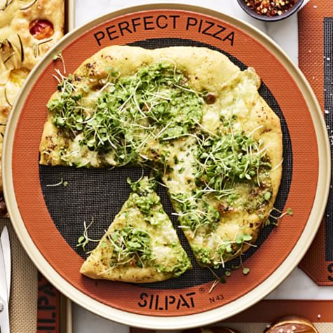 Bake until the crust is golden brown and the cheese is bubbling, about 12 minutes. Let the flatbread cool for 3 minutes, then top with a few generous dollops of the pesto. Garnish with sprouts, chives, a sprinkling of red pepper flakes and a few grindings of black pepper. Cut into slices and serve immediately. Makes one 10-inch (25-cm) flatbread.