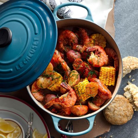 Chef, cookbook author and host of the TV series A Chef’s Life, Vivian Howard explains that although her childhood home in North Carolina was only an hour from the coast, her family never really went to the seaside, so she didn’t learn about leisurely seaside cooking, like Low Country boils, until she was in college. But as soon as she introduced her family to the idea of boiling corn, sausage, shrimp and potatoes in a highly seasoned broth and dumping it out on newspaper on the table, they adopted the tradition as their own. “Everybody enjoys the act of eating communally,” she says, so to serve this, put the platter in the middle of the table with a big spoon for serving, and arm all your diners with bowls and plenty of napkins. She says, “Make sure everyone gets some broth and that they know to dip all the components down into it for extra flavor.”