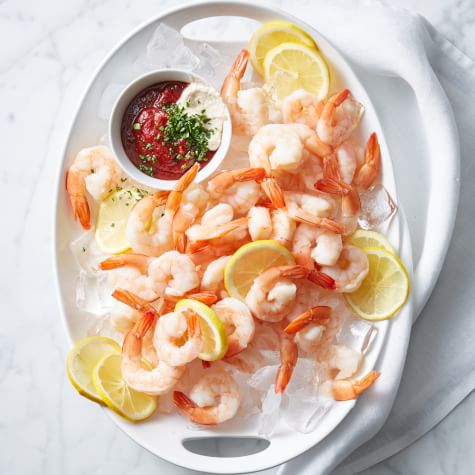 When ready to serve, cut the remaining 2 lemons into thin wheels. Place the crushed ice on a large serving platter. Top with the shrimp and serve with the lemon wheels, cocktail sauce and horseradish alongside. Serves 6.
