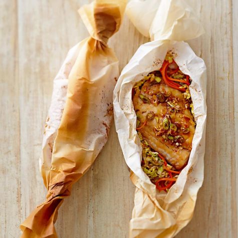 An Asian-inspired marinade amps up the flavor of red snapper, which is cooked in a parchment-paper packet along with carrots and napa cabbage. For a complete meal, serve over steamed rice. The recipe was created for a Cuisinart steam oven, but you can use a conventional oven instead. Assemble the packets as directed, then bake in a preheated 400°F oven until the snapper is cooked through and the vegetables are tender, 15 to 18 minutes.