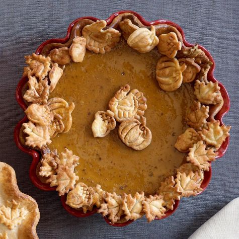 Using our gluten-free piecrust mix allows you to make a beautiful pumpkin pie that everyone at the holiday table can enjoy. To add a fanciful finish to this pie, as shown here, use decorative cutters or a paring knife to create autumnal shapes from rolled-out gluten-free pie dough. Then bake the cutouts and place them on the baked and cooled pie. When preparing this pie, be sure to use a deep-dish pie dish.