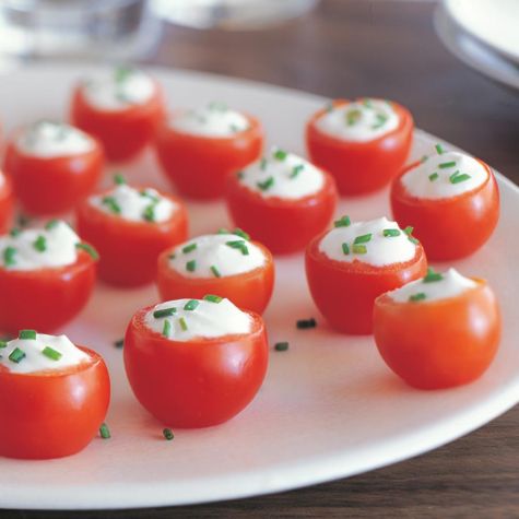 Transfer the filled tomatoes to a platter, sprinkle with the chives and serve. Makes about 40 stuffed cherry tomatoes.