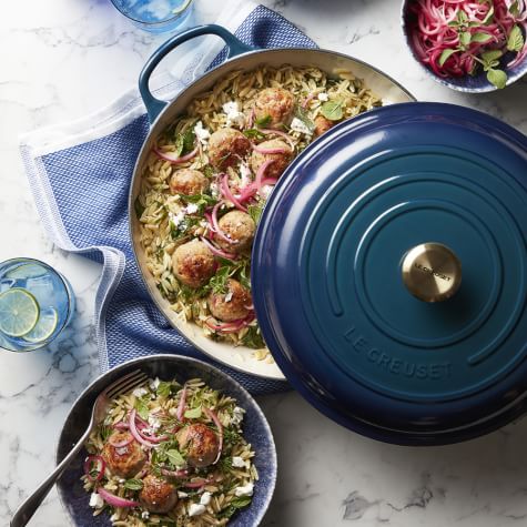 When the weather turns cold and you’re craving comfort food, you can’t go wrong with a big batch of hearty meatballs. Our Greek-inspired version includes ground chicken, warming spices and whole milk yogurt, which lends moisture. To complete this soul-satisfying meal, serve the meatballs over a bed of orzo laced with kale, tangy feta cheese and fresh herbs. A garnish of quick-pickled red onion adds a pop of brightness and crunch. The same pot is used for cooking both the meatballs and the orzo, making cleanup a breeze.