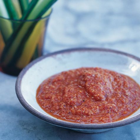 While the peppers are still hot, slip them into a paper bag, seal the top and let steam for 5 minutes. Remove the peppers from the bag and, using your fingers or a paring knife, peel away the skin. Cut off the stem and remove and discard the seeds. Coarsely chop the peppers. Slide the garlic off the skewer and coarsely chop.