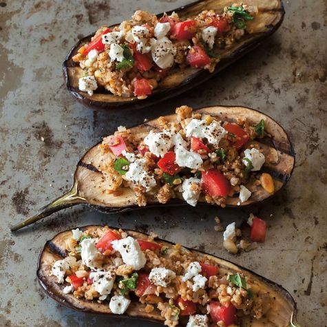 Grilled Eggplant Stuffed with Bulgur, Feta and Pine Nuts