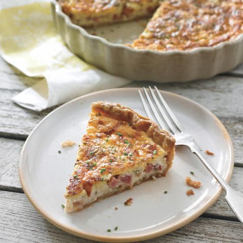Smoked ham and Gruyère cheese are classic ingredients in this celebrated French dish. This version adds a touch of crème fraîche for flavor and richness and a sprinkle of chives for freshness. Quiche is equally delicious served warm or at room temperature, which makes it ideal for almost any occasion.