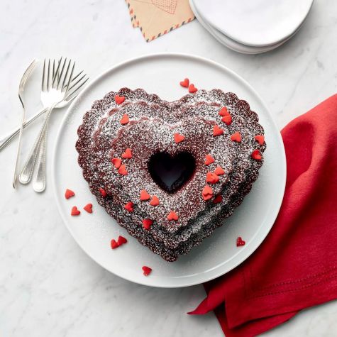 Preparing a moist red velvet Bundt cake is simple using our cake mix flavored with rich cocoa. Baking it in our scalloped heart-shaped pan results in a dessert that’s worthy of the most romantic of occasions.