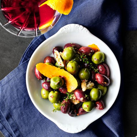 Drain the green and black olives from the brine or oil that they’re packed in and place them in a medium bowl. Add the orange zest, garlic, fennel seeds, thyme leaves, red pepper flakes, 1/2 tsp. salt and 1/2 tsp. black pepper. Pour the olive oil over the mixture, add the thyme sprigs and toss to combine.