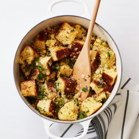 You can make the cornbread from scratch or purchase some at a bakery for this classic stuffing from Ina Garten, America’s beloved Barefoot Contessa. Serve it alongside your roast turkey, or do as Ina does and shake up tradition by using it to stuff Cornish hens for Thanksgiving dinner.
