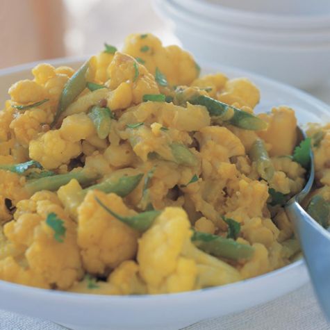 Put the potatoes, cauliflower and green beans in a slow cooker. Pour the contents of the fry pan over them. Sprinkle with the 1 1/2 tsp. salt and stir to combine. Cover and cook on high for 4 hours or on low for 8 hours according to the manufacturer’s instructions. Add the cilantro and stir to combine. Adjust the seasoning with salt and serve immediately. Serves 6 to 8.