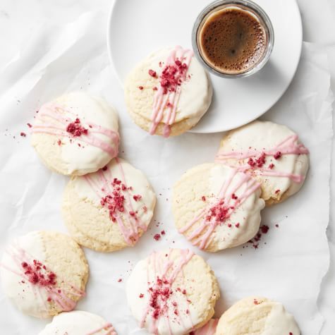 We give sugar cookies a citrusy twist by adding lemon zest and juice to the dough. Then we dip the baked cookies in melted white chocolate and drizzle on a raspberry glaze. These fanciful sweet treats are the perfect accompaniment to hot tea or a steaming cappuccino.