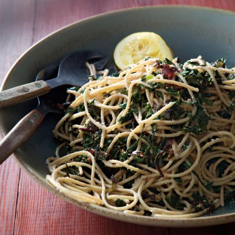 Spaghetti with Collard Greens, Hazelnuts and Caramelized Onions