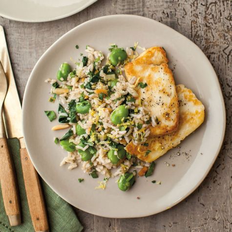 Fava Bean and Spinach Pilaf with Fried Halloumi