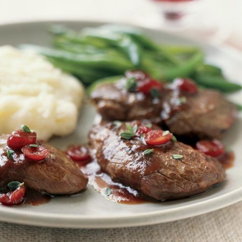 Divide the meat among warmed individual plates. Spoon an equal amount of the sauce over each serving, dividing the cranberries evenly as well. Serve immediately. Serves 4.