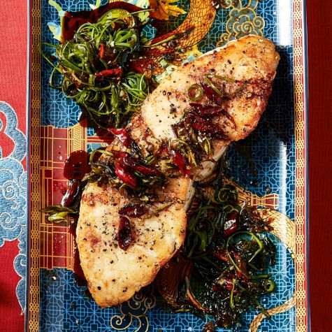 Prized for its rich, buttery flavor and tender texture, Chilean sea bass takes well to bold seasonings and sauces. Here chef Melissa King, an entrepreneur, activist and winner on Top Chef, pairs the fish with a flavor-packed sauce that includes two types of soy sauce, fresh ginger, garlic and mildly spicy Sichuan chiles. She chose this dish to serve during Lunar New Year, “a time to celebrate and gather with your loved ones over a large spread of food,” says the chef.