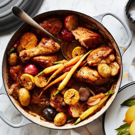 Season the chicken with salt and pepper. In the same pot, working in batches, brown the chicken on all sides, 8 to 10 minutes per batch. Return all the chicken to the pot and add the carrots, potatoes and braising sauce. Cover the pot, transfer to the oven and cook until the chicken is fork-tender, about 1 hour. Skim the fat off the sauce, garnish with lemon halves and serve. Serves 4 to 6.