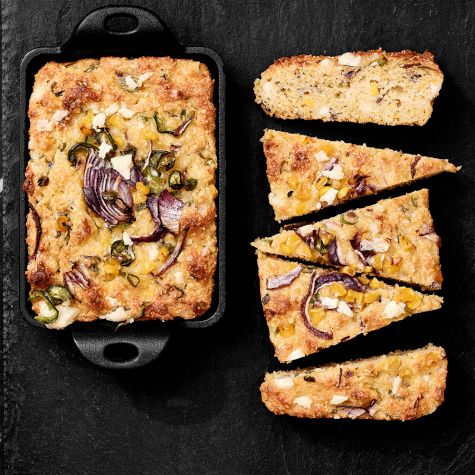 Filled and topped with tangy feta cheese and a medley of veggies, including fresh corn kernels, this cornbread makes a fantastic accompaniment to summer barbecues. Jalapeño chiles add a mild jolt of heat, while ground cumin lends warm, earthy notes. To ensure even baking, we use miniature cast-iron pans, which retain and distribute heat well. Enjoy this savory cornbread warm from the oven, slathered with salted butter.