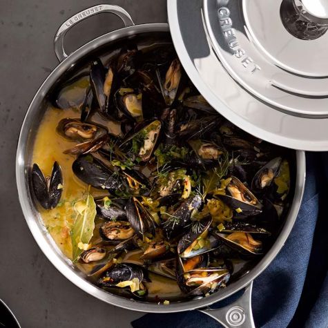 If you want to prepare a sophisticated meal in almost no time at all, you can’t beat mussels, which are a crowd pleaser when cooked simply with wine and shallots, as in the French classic known as moules marinière. Here, we take that iconic Gallic dish and give it a little twist (and a hint of color) with saffron, but you can omit it if you prefer. Be sure to discard any mussels that are open when raw (unless they close when you tap them on your work surface), and then discard any that remain closed once they have been cooked.