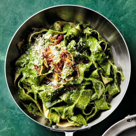 Although pesto is traditionally made with fresh basil, almost any tender herbs can be used, as well as greens like spinach and arugula—even baby kale or chard—making this a great recipe for using up any leftovers that are on the verge of wilting in the fridge. It’s also a versatile recipe for pantry items, such as dried Calabrian chiles or breadcrumbs, which can be toasted on the stovetop and added as a garnish. If you want to make or purchase fresh pasta, substitute 1 to 1 1/4 lb. (500 to 625 g) fresh pasta for the dried version.