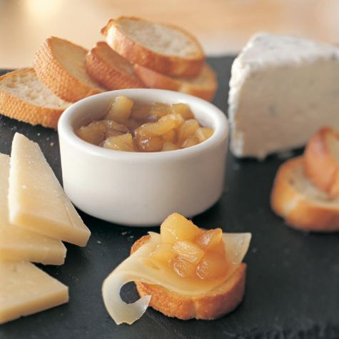 Transfer the compote to a bowl and place on a large platter. Arrange the cheeses and crostini around the compote and serve. Alternatively, layer a slice of cheese and a dollop of compote on each crostini, arrange on a serving platter and serve. Makes about 24 pieces.